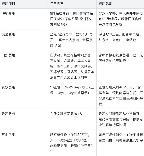 :安排4天喀什古城深度游,涵盖开城仪式、百年老茶馆、手工艺街等,解锁“活着的千年古城”每一面;2.帕米尔全景覆盖:畅游白沙湖、慕士塔格峰、塔县石头城、金草滩,一次性打卡帕米尔高原核心景点;3.沙漠民俗双体验:塔克拉玛干沙漠边缘徒步、和田玉石巴扎探秘、库车大峡谷探险,兼顾自然与人文;4.纯玩保障升级:签订《南疆纯玩承诺书》,导游薪酬与购物脱钩,每日预留2-3小时自由活动,拒绝“打卡式”游览;5.住宿餐饮优选:喀什住古城精品民宿(含尔族特色早餐),其他地区住四星酒店,餐饮含18正餐,覆盖烤全羊、馕坑肉等20+南疆特色美食。2025最佳南疆喀什10日纯玩行程(每日细化版)