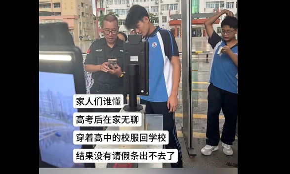 近日,一男生高考后在家无聊,穿着高中的校服回学校,结果出不去了网友:这个我拍不了,每一届校服不一样