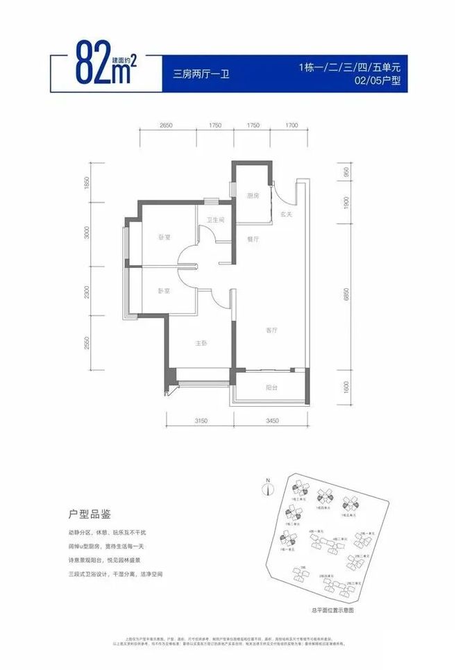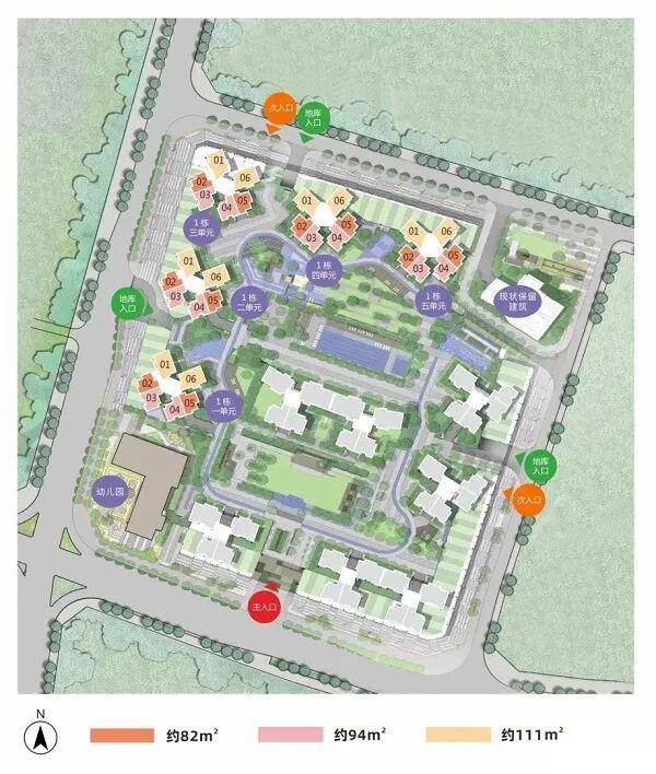 每栋的户型分布都是一致的,其中02/05户型是82㎡的三房一卫,03/04是94㎡的三房两卫,01/06户型是111㎡的四房两卫,均为朝南户型,户型方正实用,采光通风俱佳。