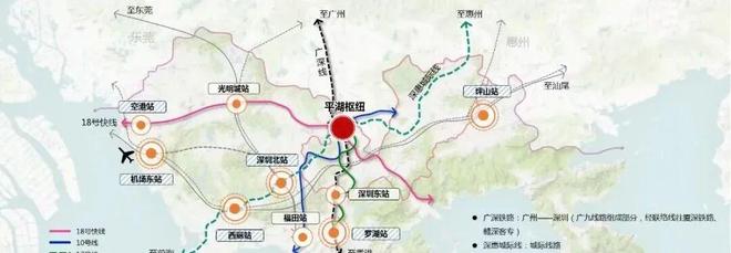 根据龙岗十四五规划,平湖将重点打造两大枢纽:平湖枢纽、白泥坑枢纽。离我们比较近的是平湖枢纽,这里汇聚四条轨道: