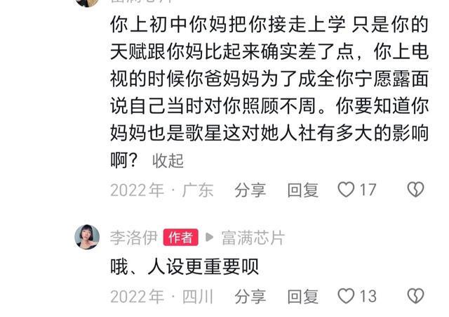 回复网友评论时,李洛伊直言母亲对她没有关心和爱,上综艺节目的道歉只是为了打造人设,言语中尽是伤心和委屈。