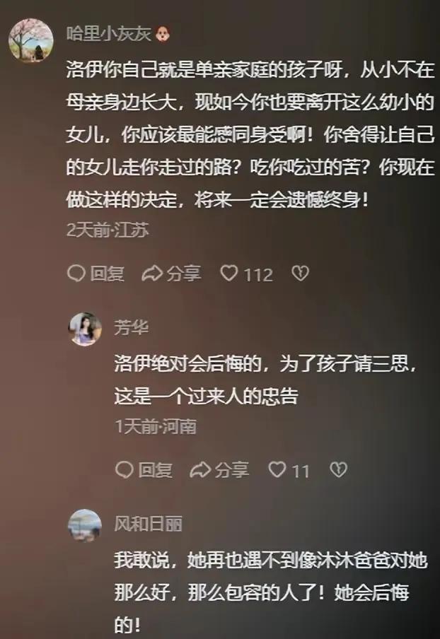 很多人在劝洛伊,不要把女儿沐沐留给父亲,也许,洛伊不是不爱女儿,而是没有爱的能力,伤痕累累的她不知道如何呵护女儿的成长,让她不受伤害。